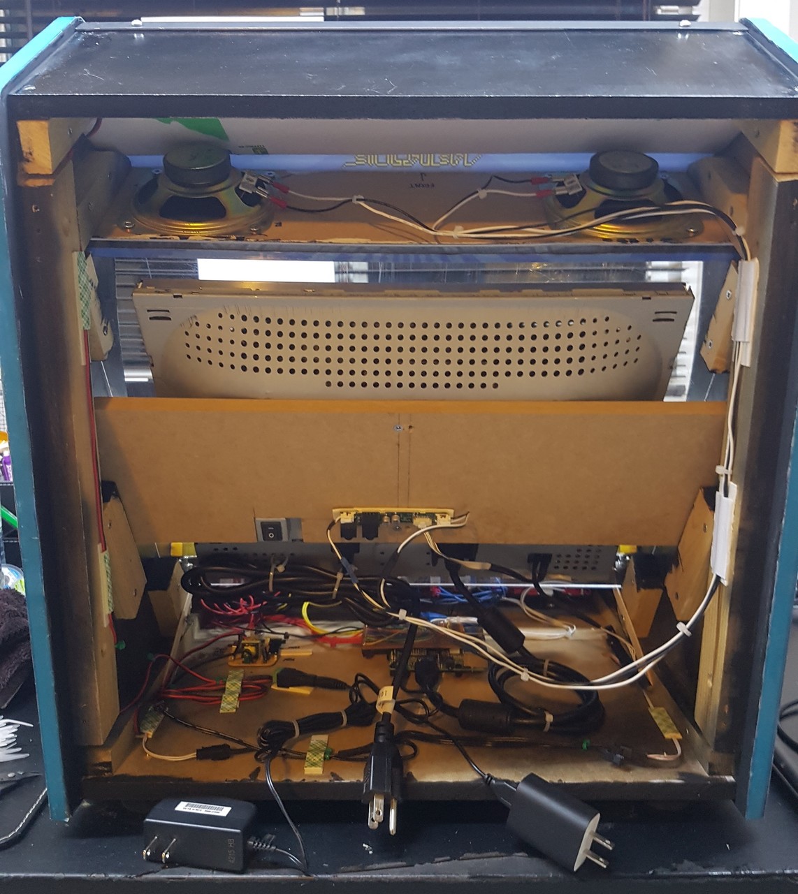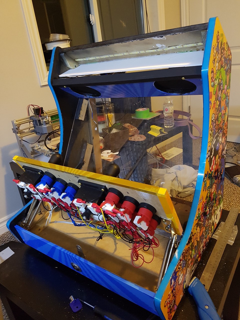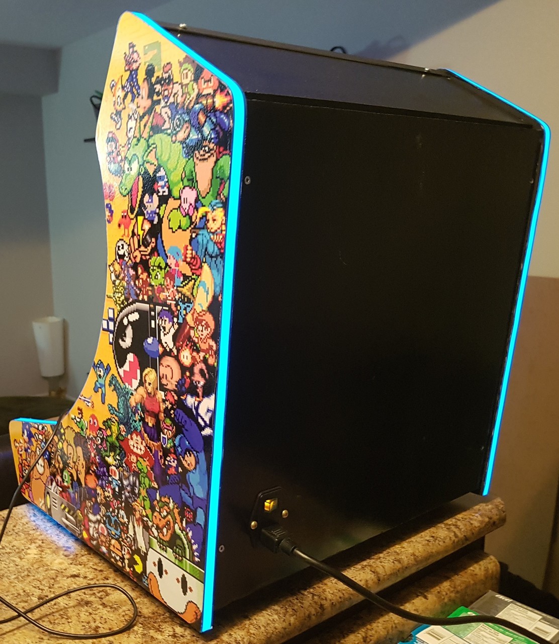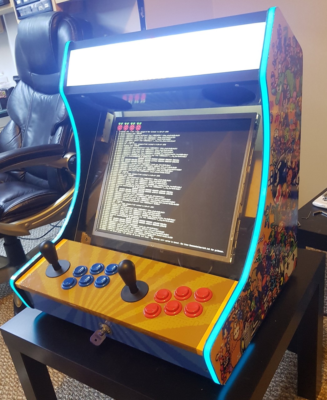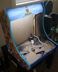 I first dreamed of building an arcade cabinet from a young age, spending many hours researching on the BYOAC forums. My first order for joysticks and buttons was submitted in early 2006. After many years of no progress, in late 2017 all the pieces came together thanks to the WeeCade plans (and a friend who graciously printed my Vinyl for free). While some of the parts were sold over the years, the buttons in this arcade are still from the original 2006 order. The plans were followed fairly accurately with a few small modifications: some dimensions were modified to fit the screen; the T-moulding was replaced with glowing EL tape; and the control panel was placed on lifting hinges, held down by lock and key.