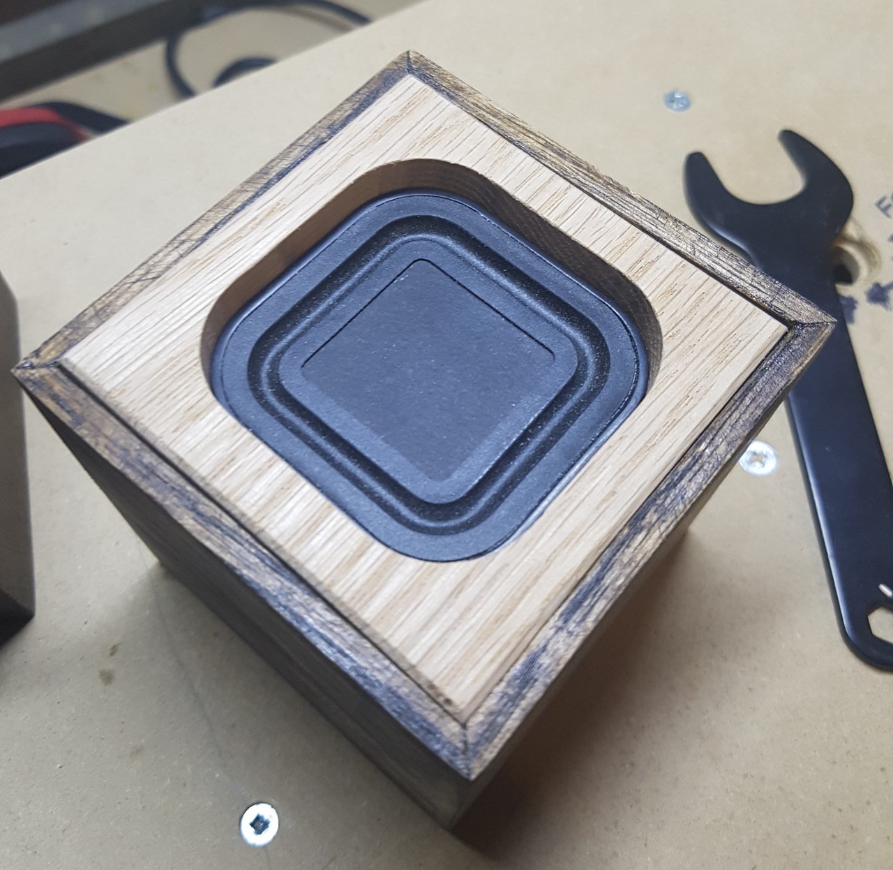 Each speaker is made of solid oak with contrasting espresso stain. To ensure perfect fits, many templates were 3D-printed to assist with cutting. Each speaker design was thoroughly 3D-modelled to guarantee adequate volume and seamless integration. Two separate designs were tested, one with round edges and veneer, the other with mitred corners and continuous grain. The square box ended up being the favourite.