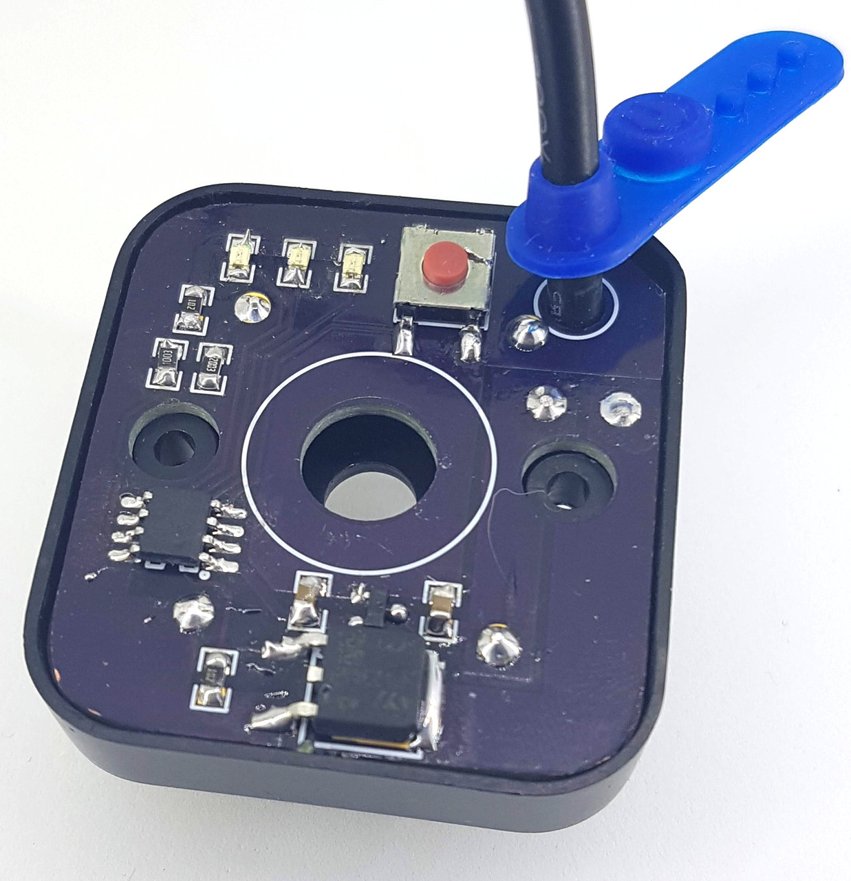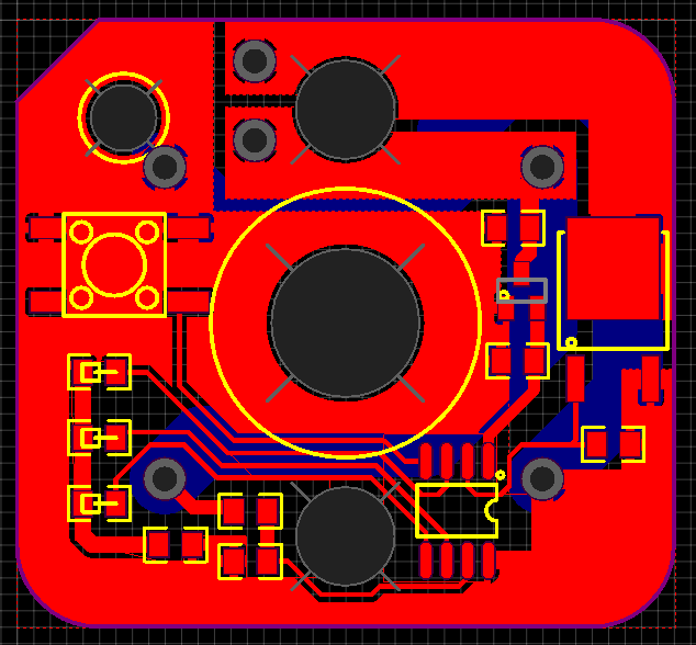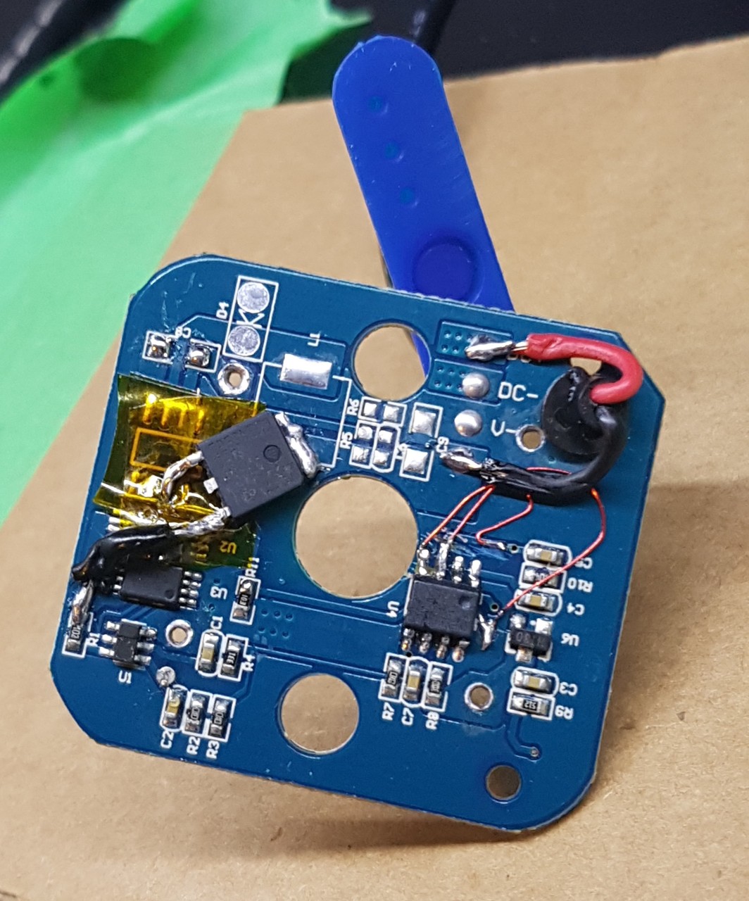 The custom PCB uses a PIC12F1572 with the same pushbutton and LED configuration, but allows the button to be held to set the output power in three levels: (off), low, medium, or high. There is no schematic because of the ridiculous simplicity of the overall circuit, which was thrown together super quickly as a test for my cheap PCB milling machine.